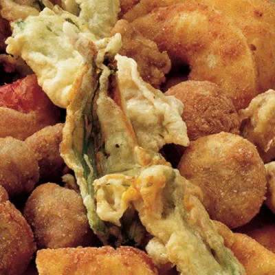 Semolini dolci, cipolle e carciofi in pastella con salsa all’erba cipollina