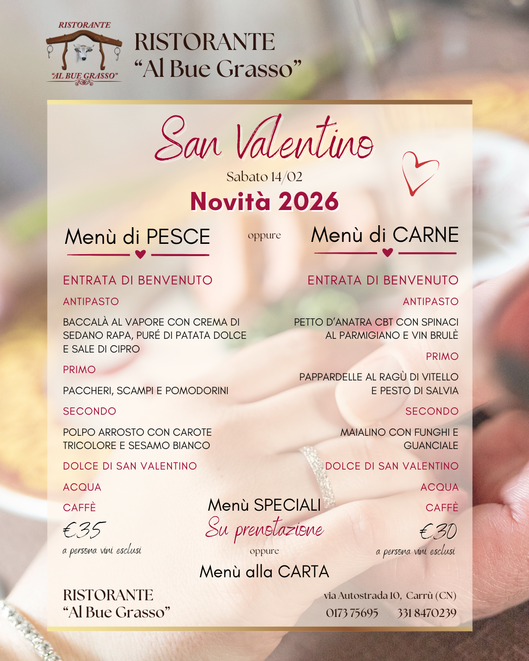 Il ristorante Al Bue Grasso di Carrù è lieto di presentare la sua offerta enogastronomica per la festa degli innamorati.