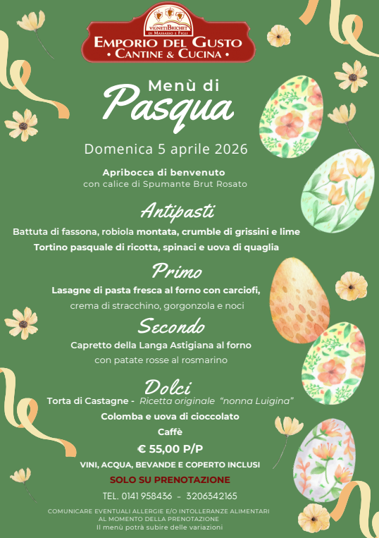 Il pranzo di Pasqua nell’Emporio del Gusto Cantine & Cucina è una celebrazione solenne e conviviale, caratterizzata da un menu che fonde la ricca tradizione contadina con i piatti raffinati delle corti sabaude.