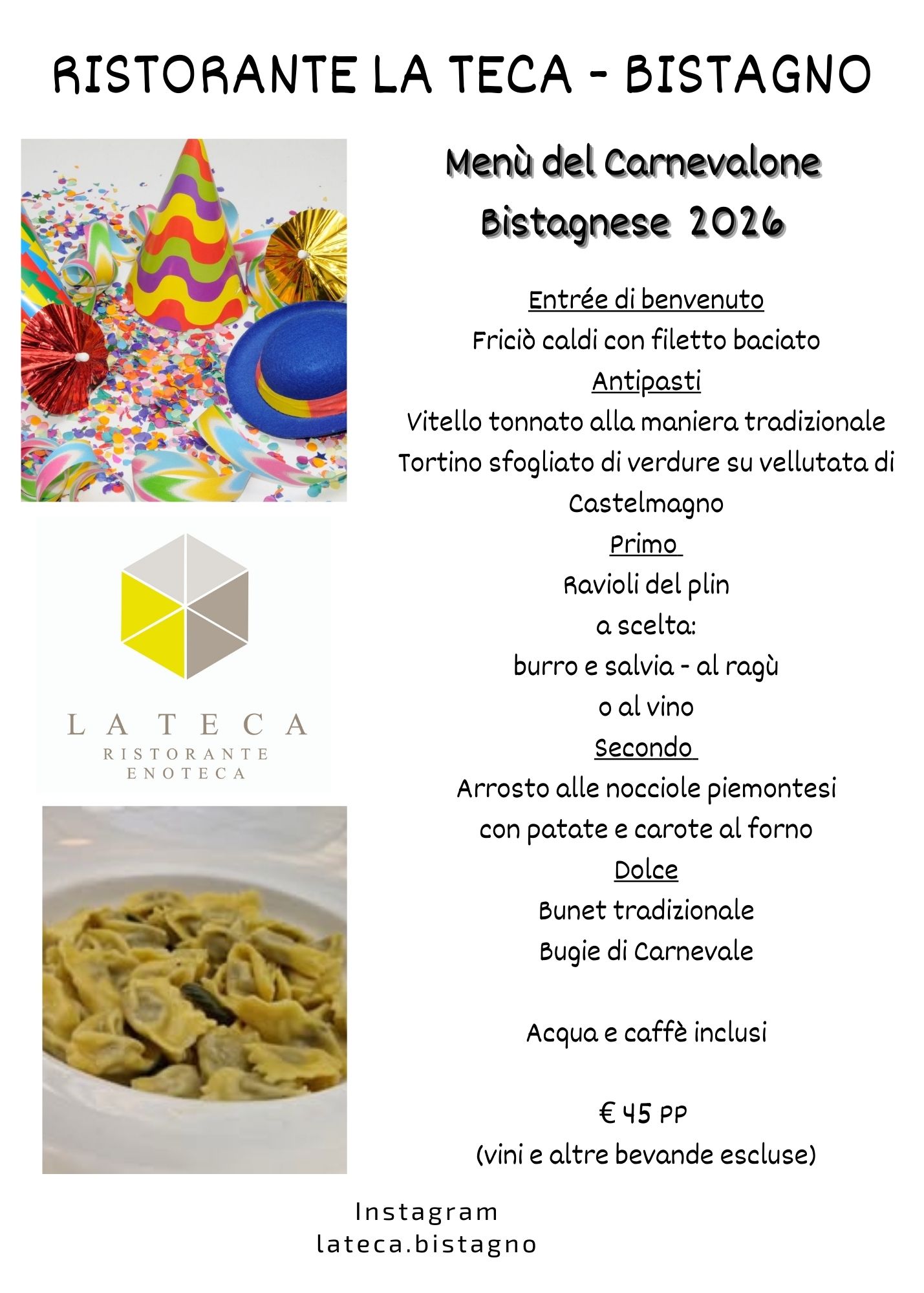 Nei giorni del Carnevalone Bistagnese il nostro ristorante vi invita a festeggiare con un menù tipico del territorio, ispirato ai piatti della tradizione di questo periodo