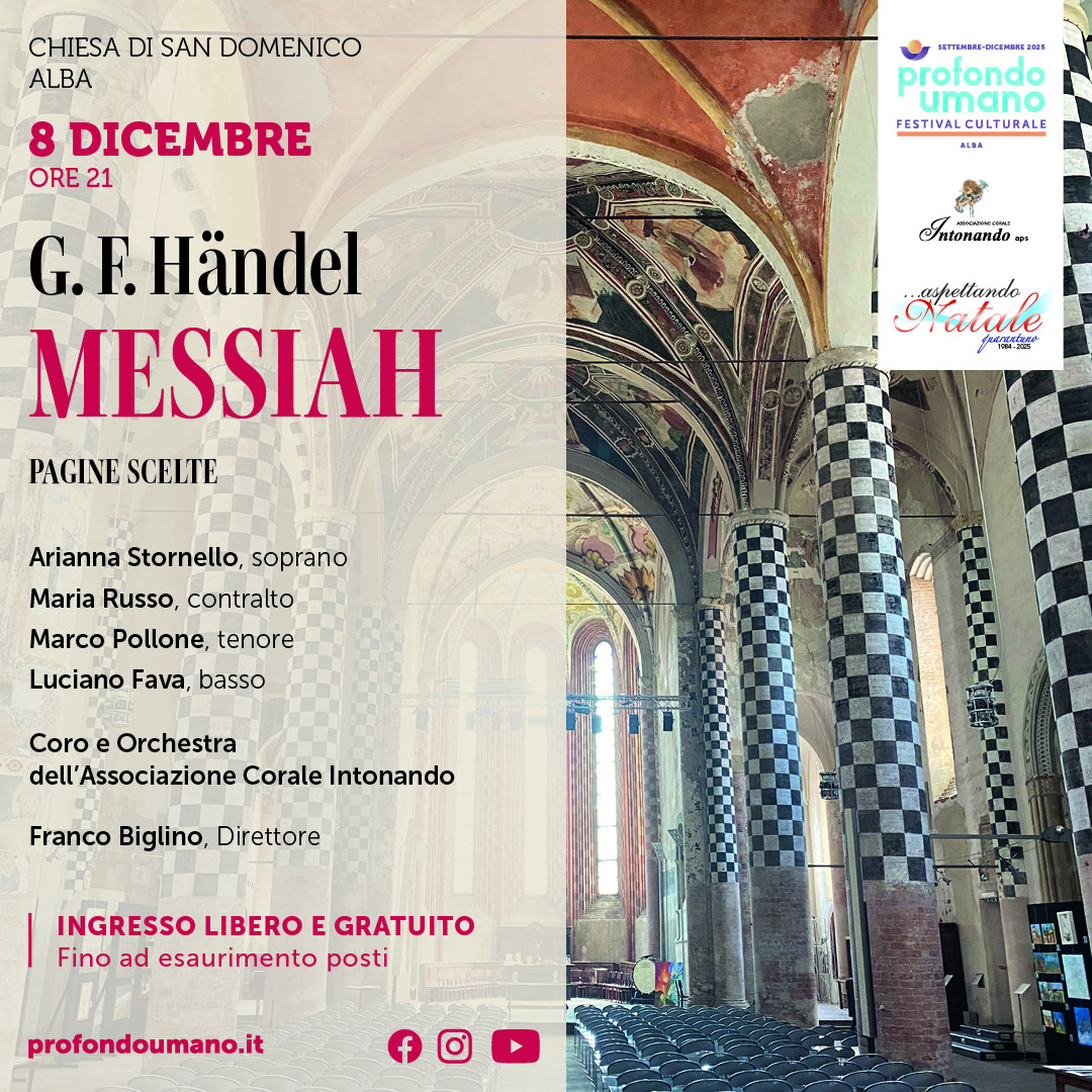 Nell’ambito della rassegna “…aspettando Natale”, giunta alla sua 41^ edizione, il coro e orchestra dell’Associazione Corale Intonando, diretti dal maestro Franco Biglino, eseguiranno alcune pagine scelte del Messiah di Haendel nella Chiesa di San Domenico ad Alba.