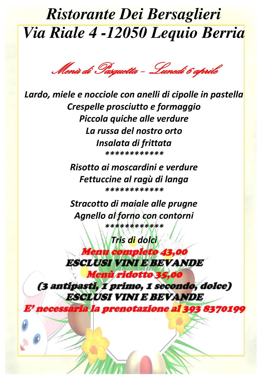 Il ristorante Dei Bersaglieri vi invita a trascorrere Pasquetta nei suoi locali per rilassarvi all’insegna del buon cibo.